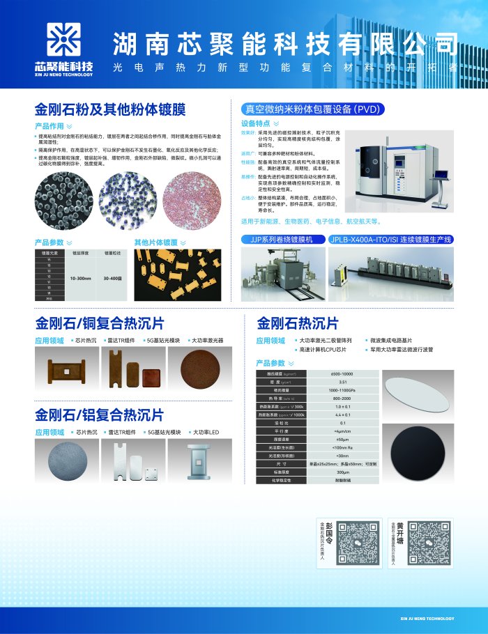 湖南芯聚能科技有限公司總部位于湖南長(zhǎng)沙,技術(shù)源起為中南大學(xué)氣相沉積技術(shù)與薄膜材料研究室(1999年成立,致力于光電聲熱力新型功能復(fù)合材料開發(fā)20余年),是國(guó)內(nèi)*早開展CVD金剛石和金屬基復(fù)合溫控材料研究的科研團(tuán)隊(duì)之一。針對(duì)國(guó)家重大科技創(chuàng)新需求和新一代電子元件散熱問題,通過材料、工藝、技術(shù)及裝備多維度聯(lián)合,系統(tǒng)研究了CVD金剛石大面積高品質(zhì)制備工藝、導(dǎo)熱顆粒增強(qiáng)金屬基復(fù)合材料界面控制技術(shù)、多維度金剛石/金屬?gòu)?fù)合界面的設(shè)計(jì)理論及材料制備原理,形成了高性能復(fù)合溫控材料制備成型一體化技術(shù)以及低成本穩(wěn)定量產(chǎn)工藝,擁有國(guó)際先進(jìn)、國(guó)內(nèi)**的高性能溫控材料低成本、量化制備技術(shù)和成套生產(chǎn)裝備。