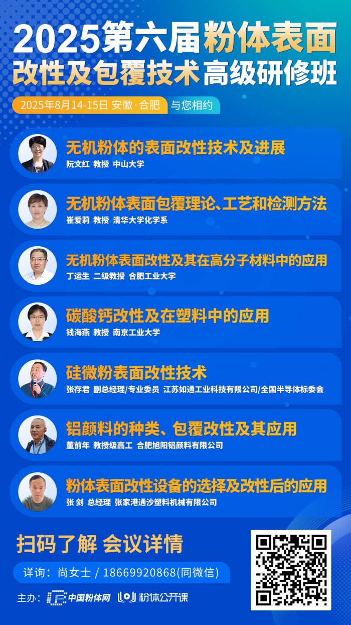 中國粉體網(wǎng)訊 為推動粉體表面改性及包覆技術(shù)發(fā)展,促進產(chǎn)學研交流合作,中國粉體網(wǎng)粉體公開課將于2025年8月14-15號,在安徽省合肥市舉辦“2025第六屆粉體表面改性及包覆技術(shù)高級研修班”,青島三銳佰德新材料有限公司邀您一同參加!