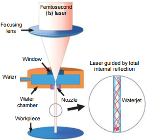 水導(dǎo)激光切割技術(shù),又稱激光微射流技術(shù)(Laser MicroJet,LMJ),是一項(xiàng)以水射流引導(dǎo)激光束對(duì)待加工工件進(jìn)行切割的復(fù)合加工技術(shù)。由于水和空氣的折射率不同,在激光束以一定角度照射在水與空氣交界面時(shí),如果入射角小于全反射臨界角,激光會(huì)發(fā)生全反射而不會(huì)透射出去,這就使激光能量始終被限制在水束中從而使激光沿水束的方向進(jìn)行傳播。