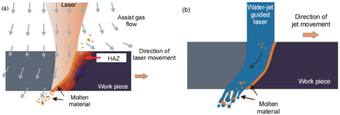 激光切割與水導(dǎo)激光切割的加工示意圖.(a)傳統(tǒng)激光(熱損傷區(qū)大),(b)水導(dǎo)激光(熱損傷區(qū)極。