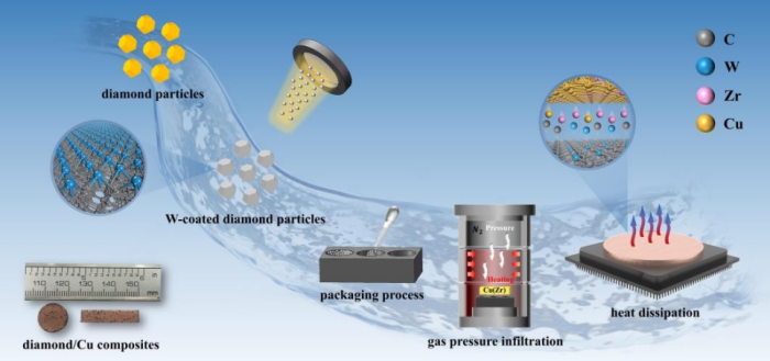 隨著電子元器件向集成化、小型化和高功率化發展,散熱問題日漸突出。開發具有優異熱性能的熱管理材料以實現高效散熱是電子產業發展過程中的關鍵問題。銅是一種成熟的電子封裝材料,價格低、加工性能好;金剛石單晶的熱導率可達到2200W/(m·K),遠遠超過傳統導熱材料,其在高溫環境中也能夠保持出色的導熱性能。而金剛石/銅復合材料能夠更好地結合金屬基體和金剛石增強相的優勢,成為新一代極具發展潛力的熱管理材料。