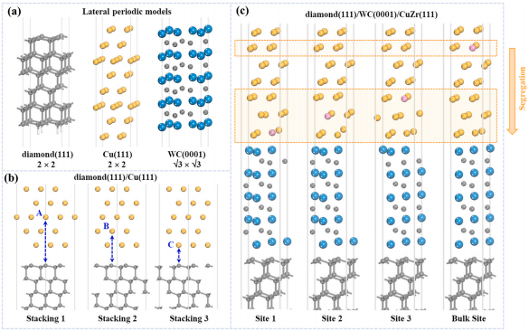 (a)橫向周期模型;(b)金剛石(111)/Cu(111)和(c)金剛石(111)/WC(0001)/CuZr(111)的界面結構模型