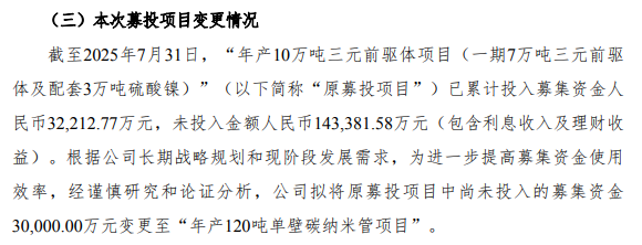 中國粉體網訊 8月19日,道氏技術發布公告表示,根據公司長期戰略規劃和現階段發展需求,將“年產10萬噸三元前驅體項目”未投入的募集資金變更至“年產120噸單壁碳納米管項目”。