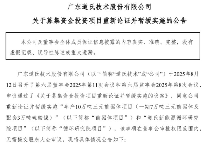 此前8月13日,道氏技術發布公告稱,公司近期召開會議,審議通過了《關于募集資金投資項目重新論證并暫緩實施的議案》,同意公司重新論證并暫緩實施“年產10萬噸三元前驅體項目(一期7萬噸三元前驅體及配套3萬噸硫酸鎳)”和“道氏新能源循環研究院項目”。