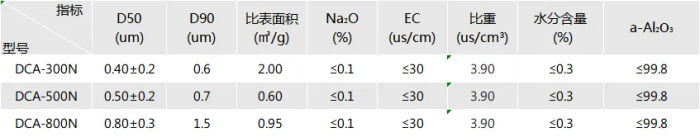 Ⅱ、納米氧化鋁DCA-N系列主要性能指標: