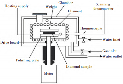 機械拋光(MP):MP是利用金剛石與高速旋轉的拋光盤(鑄鐵盤、砂輪盤)相互摩擦產生脆性斷裂去除表面材料的拋光工藝,同時,由于高速旋轉的拋光盤與金剛石摩擦會產生高溫,而高溫提供了“硬”的金剛石相向“軟”的石墨相轉變的驅動力,通過利用微切削與石墨化相結合的原理實現金剛石的拋光。