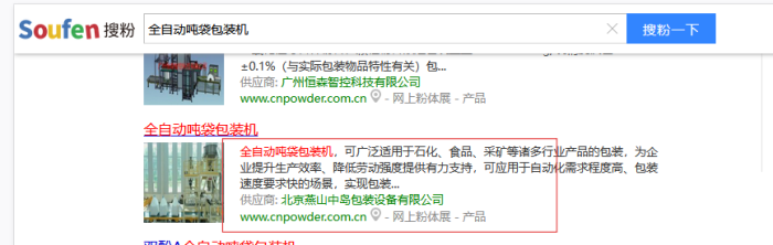 粉體網結合北京燕山中島包裝設備有限公司的產品線特點,在粉體展——包裝設備頻道重點展示核心產品,同時通過搜粉網頁優先推送會員展臺,讓用戶在搜索環節就能快速捕捉品牌信息。這種“多觸點”布局不僅加速了用戶與品牌的連接,更從搜索引擎等渠道引流了更多潛在咨詢,顯著提升了詢盤量。當用戶在粉體網搜索全自動噸袋包裝機相關關鍵詞時,北京燕山中島包裝設備有限公司的產品能夠優先展示在用戶面前,提高了用戶發現公司產品的概率。