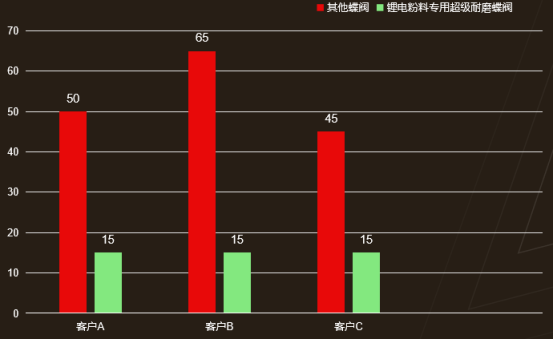 4、綜合計(jì)算,使用鋰電粉料專用超級(jí)耐磨蝶閥使用成本僅為其他蝶閥的30%,可為客戶節(jié)約70%蝶閥成本。