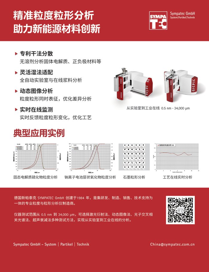 德國新帕泰克干法激光粒度儀,憑借其技術專業、性能穩定和操作簡便的優勢,成為固態電池材料測試的理想選擇。此外,從原礦材料到電池制造與回收,德國新帕泰克從0.5 nm到33,792 μm為電池材料的粒度與粒形表征提供各種定制化的解決方案。