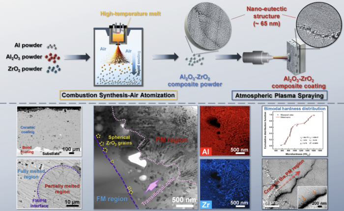 哈爾濱工業大學研究團隊報道了一種全新的“燃燒合成-空氣霧化(CS-AA)技術”,成功制備出具有納米共晶結構的Al2O3-ZrO2復合粉體。該粉體用于等離子噴涂后,獲得了獨特納米共晶結構的復合陶瓷涂層,在耐磨保護方面展現出優異性能。