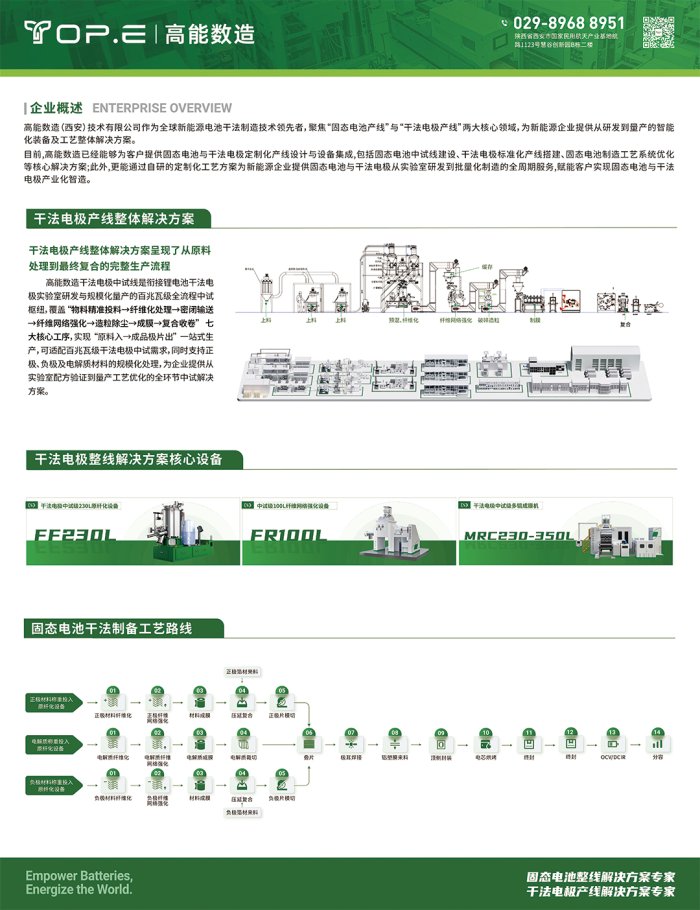 高能數(shù)造(西安)技術(shù)有限公司是全固態(tài)電池智造技術(shù)引領(lǐng)者,聚焦"固態(tài)電池產(chǎn)線"與"干法電極產(chǎn)線"兩大核心領(lǐng)域,為新能源企業(yè)提供從研發(fā)到量產(chǎn)的智能化裝備及工藝整體解決方案。