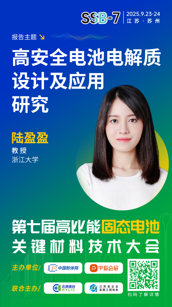 針對固態電池產業化發展現狀,中國粉體網聯合合源鋰創、江蘇省企業發展工程協會將于2025年9月23-24日在江蘇· 蘇州舉辦第七屆高比能固態電池關鍵材料技術大會。為致力于固態電池技術開發的企業,科研院校,以及新能源汽車、儲能、消費電子等終端企業提供信息交流的平臺,開展產、學、研合作。屆時,來自浙江大學的陸盈盈教授將作題為《高安全電池電解質設計及應用研究》的報告。