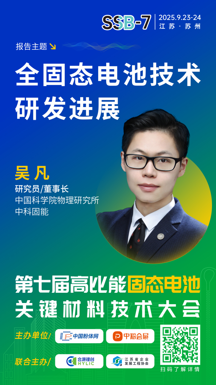 針對固態電池產業化發展現狀,中國粉體網聯合合源鋰創、江蘇省企業發展工程協會將于2025年9月23-24日在江蘇· 蘇州舉辦第七屆高比能固態電池關鍵材料技術大會。為致力于固態電池技術開發的企業,科研院校,以及新能源汽車、儲能、消費電子等終端企業提供信息交流的平臺,開展產、學、研合作。屆時,中國科學院物理研究所研究員、中科固能董事長吳凡將作題為《全固態電池技術研發進展》的報告。