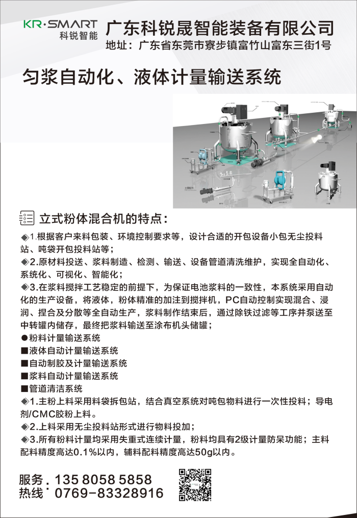 科銳創始于2006年,歷經多年穩健發展,在2025年榮耀升級,正式蛻變成為廣東科銳晟智能裝備有限公司?偛课挥趶V東省東莞市寮步鎮,是一家集研發、生產、銷售、服務于一體的新能源鋰電裝備國家級高新技術企業。公司以高粘度攪拌、干燥、研磨、分散及智能化輸送系統為核心技術,產品覆蓋鋰電軟體工程全領域,包含智能動力攪拌機、真空干燥機、砂磨機等,還提供MES系統及物流輸送系統。我們為客戶提供物料處理自動化一站式解決方案,從拆包投料、物料存儲到智能控制,全流程覆蓋。公司產品廣泛應用于新能源行業、復合材料、膠黏劑、醫藥、日化、食品、涂料、5G材料、半導體材料等多個領域,滿足各類個性化定制需求。
