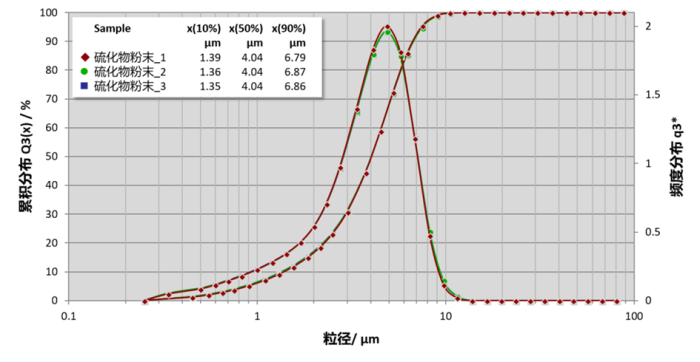 在實際測試中,德國新帕泰克對硫化物固態電解質粉末進行了3次連續測試,結果顯示其D50值穩定在4μm,且測試分布情況基本一致,充分證明了設備的高精度和優異的重復性。