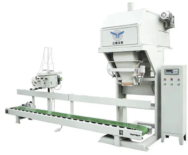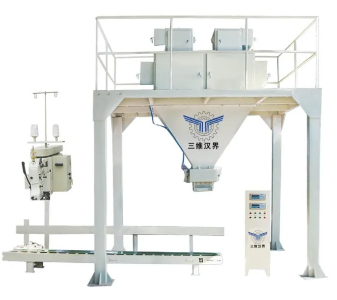 需人工協助上袋、自動稱量、夾袋、充填、自動輸送、縫包;