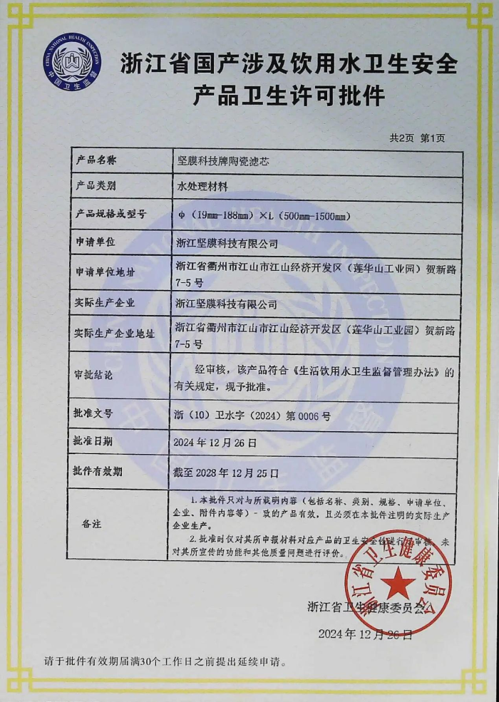 涉水許可批件則遵循省級涉水產品衛生行政許可要求,從原材料合規性、生產現場衛生規范,到產品衛生安全性與性能穩定性,均經過層層核查。碳化硅陶瓷膜成功獲批,證明完全符合飲用水行業法律法規與標準規范,可合規服務于各類飲用水處理場景。
