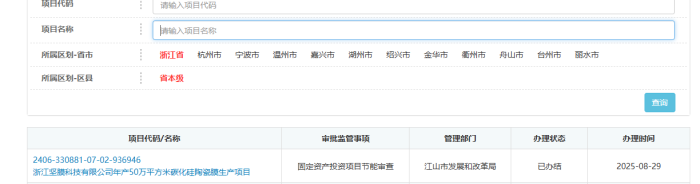 今年八月份,浙江省投資項目在線審批監管平臺發布了關于堅膜科技年產50萬平方米碳化硅陶瓷膜生產項目節能審查的批復。該項目為江山市2025年重點建設項目,也是江山市首個與衢州高質量基金簽約的項目。