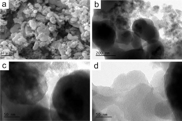 以鋯硅渣為硅源合成的MCM-41的SEM (a)和TEM (b,c,d)圖像