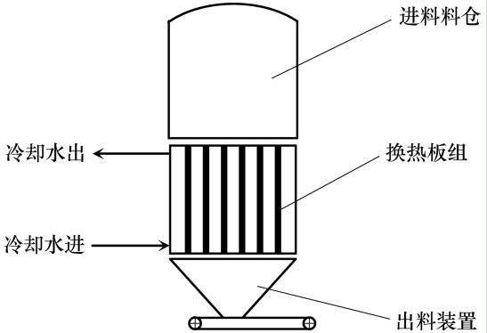 粉體流換熱器是一種間接換熱的粉體冷卻設備,通常由進料倉、傳熱板組、下料倉等組成。這種換熱方式結合了粉體密相輸送和傳統板式換熱器的設計思路,高溫固體粉料依靠自身重力自流通過板式換熱器的狹窄通道,與另一側的冷卻水進行間接換熱,達到將物料冷卻的目的,必要時可以副產熱水,回收熱量。