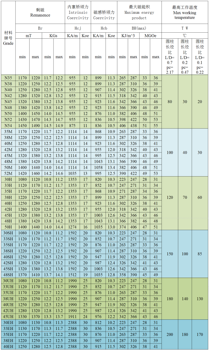 主稱代號由釹(Nd)、鐵(Fe)、硼(B)元素的化學符號組成,代表材料的基礎成分。數字部分表示最大磁能積(BH)max的標稱值,數字越大表明磁能積越高,例如N48比N35具有更強的磁能。字母后綴表示內稟矯頑力HcJ的分級,從低到高依次為:N(普通)、M(中等)、H(高)、SH(特高)、UH(超高)、EH(極高)和AH(特高)。