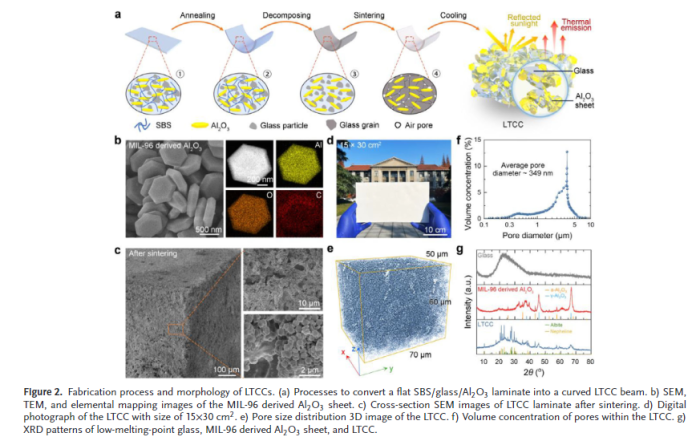 研究團隊創新性地采用MIL-96衍生的分級結構氧化鋁顆粒,該顆粒具有優化的幾何參數和高孔隙率,能夠增強光背向散射。將這些顆粒嵌入玻璃基質中,形成了低溫共燒陶瓷(LTCC),在低于1000°C的溫度下實現燒結,顯著降低了能耗。