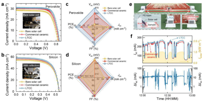 在光伏集成測試中,LTCC作為反射基底顯著提升了鈣鈦礦和硅基太陽能電池的轉換效率。戶外實驗中,LTCC使光伏模塊在中午時段短路電流平均提升10.46 mA,且在陰天條件下仍能保持性能優勢。
