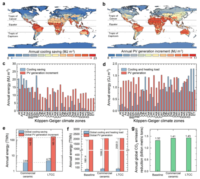 全球能源模擬顯示,LTCC在赤道地區年冷卻節能可達23 MJ/m²,光伏發電增量達17.6 MJ/m²。按氣候分區分析,多數地區可實現冷卻與光伏發電的平衡。整體來看,LTCC全球推廣后年節電量可達4.75 TWh,光伏發電增量165.12 TWh,預計年二氧化碳減排量達14.3億噸。