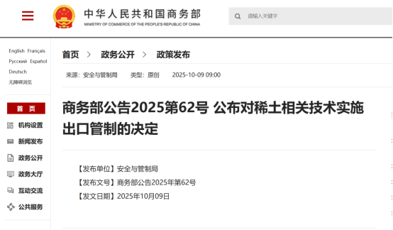 中國粉體網(wǎng)訊 為維護(hù)國家安全和利益,根據(jù)《中華人民共和國出口管制法》《中華人民共和國兩用物項(xiàng)出口管制條例》等法律法規(guī),經(jīng)國務(wù)院批準(zhǔn),商務(wù)部于2025年10月9日連續(xù)發(fā)布第61號和第62號公告,分別對稀土相關(guān)技術(shù)及境外相關(guān)稀土物項(xiàng)實(shí)施出口管制。