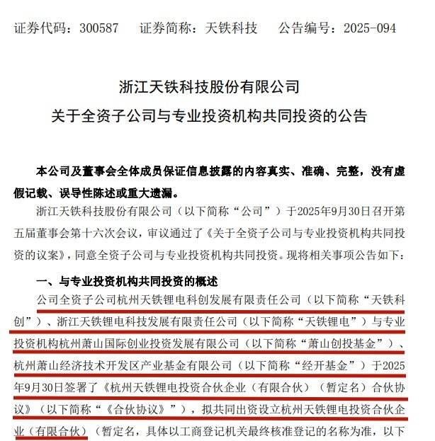 據(jù)公告消息,天鐵科技全資子公司杭州天鐵鋰電科創(chuàng)發(fā)展有限責(zé)任公司(簡稱:天鐵科創(chuàng))、浙江天鐵鋰電科技發(fā)展有限責(zé)任公司(簡稱:天鐵鋰電)與專業(yè)投資機構(gòu)杭州蕭山國際創(chuàng)業(yè)投資發(fā)展有限公司(簡稱:蕭山創(chuàng)投基金)、杭州蕭山經(jīng)濟技術(shù)開發(fā)區(qū)產(chǎn)業(yè)基金有限公司(簡稱:經(jīng)開基金)于2025年9月30日簽署了《杭州天鐵鋰電投資合伙企業(yè)(有限合伙)(暫定名)合伙協(xié)議》,擬共同出資設(shè)立杭州天鐵鋰電投資合伙企業(yè)(有限合伙)(暫定名,具體以工商登記機關(guān)最終核準(zhǔn)登記的名稱為準(zhǔn),簡稱“合伙企業(yè)”)。