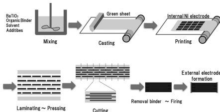 MLCC的制造過程包括:將電介質粉末材料與有機溶劑等混合均勻化→形成電介質生片→在生片上印刷內電極→層疊至預定層數→成型→切割成單個芯片→脫脂燒成→形成外部電極。電介質層通過流延法或印刷法形成。即使形成1000層以上的生片,若生片表面存在缺陷或凹凸,也會導致產品不良。因此,生片的表面平滑性和粉體高密度填充至關重要。這就要求BaTiO3粉體除了具備前述的微細、窄粒度分布和高結晶性外,還需弱凝聚性和優異的分散性。