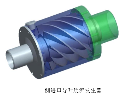 在國內(nèi),周甲偉等開發(fā)了一種側(cè)進(jìn)口導(dǎo)葉旋流發(fā)生器,該旋流發(fā)生器主要由進(jìn)氣管、一對法蘭、殼體、導(dǎo)葉管和出水管組成。軸向流(氣體或氣固混合物)通過入口進(jìn)入旋流發(fā)生器,切向流從殼體側(cè)進(jìn)口進(jìn)入,在螺旋葉片的引導(dǎo)下產(chǎn)生切向氣體運(yùn)動。旋流與軸向流和切向流結(jié)合,從出口流出。旋流強(qiáng)度是通過切向流和軸向流的比值設(shè)定來控制。