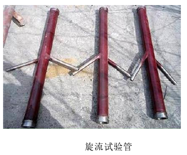李建平等設(shè)計(jì)了一組旋流試驗(yàn)管,由一根主輸送管和兩根輔助旋流管(旋流發(fā)生器)組成,副旋管周向與主輸送管相切,與軸向成45°角。旋流管前段直管用于穩(wěn)定氣流,后段直管用于觀察旋流對顆粒氣力輸送的影響。