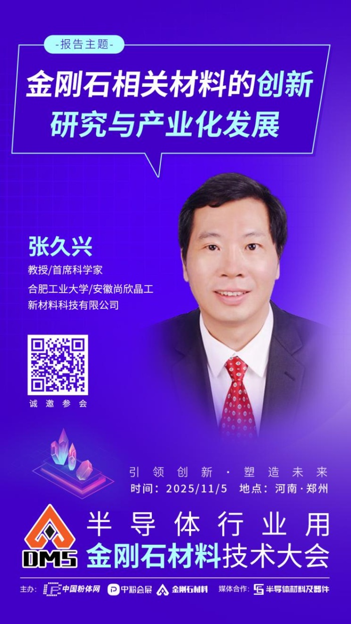 2025年11月5日,中國粉體網將在河南•鄭州舉辦“2025半導體行業用金剛石材料技術大會”。屆時,我們邀請到合肥工業大學張久興教授出席本次大會并作題為《金剛石相關材料的創新研究與產業化發展》的報告,報告將闡述SPS獨特燒結機理和效應,分析SPS技術在高新材料研究中的優勢和產業化可行性,系統介紹金剛石二級增壓用特種硬質合金、金剛石-金屬復合材料的研究進展與未來展望。