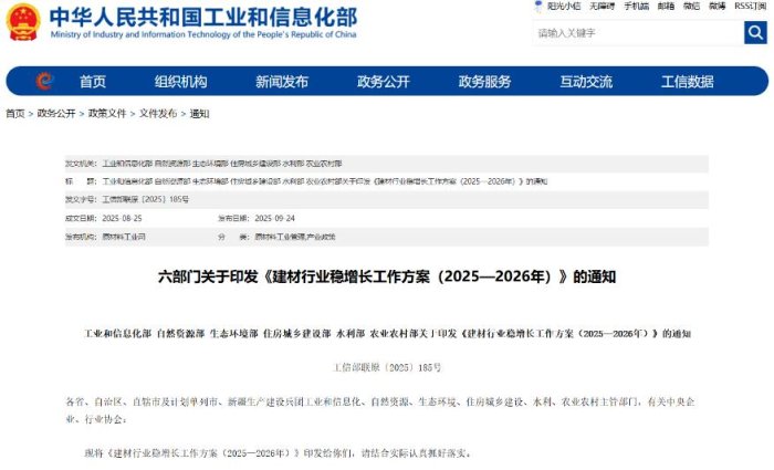 總體來說,發展先進非金屬礦物材料將是綠色建材產業高值化發展和穩定增長的關鍵一環,甚至是主要目標。8月25日,工業和信息化部、自然資源部、生態環境部、住房城鄉建設部等六部門聯合印發《建材行業穩增長工作方案(2025—2026年)》(以下簡稱《工作方案》)。