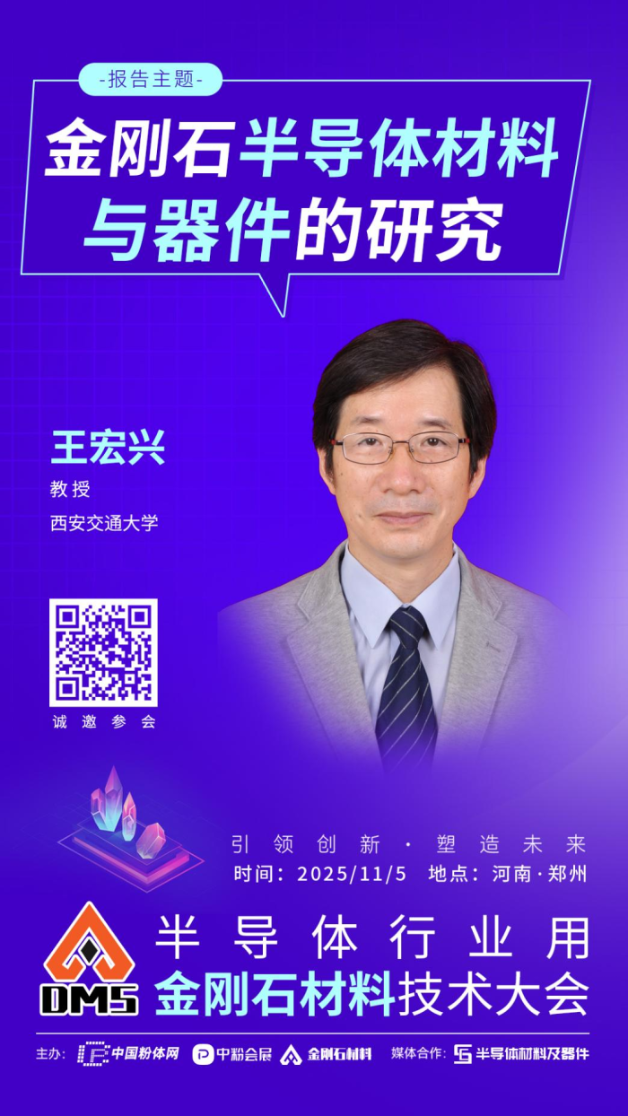 金剛石半導體在新材料、新器件、新技術等方面的不斷創新和發展,為各行各業帶來了更廣泛的應用前景。2025年11月5日,中國粉體網將在河南•鄭州舉辦“2025半導體行業用金剛石材料技術大會”。屆時,我們將邀請到西安交通大學王宏興教授出席本次大會并作題為《金剛石半導體材料與器件的研究》的報告。