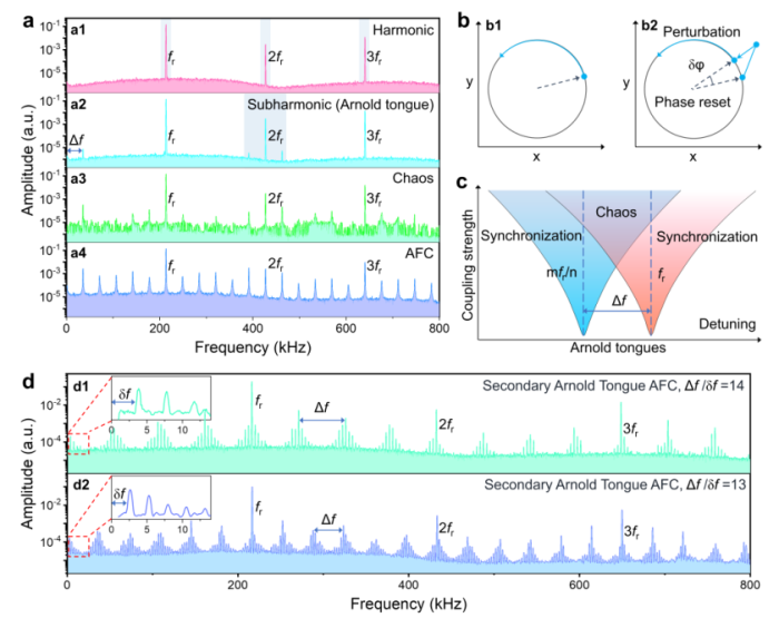 此前,山東大學(xué)劉鐸團隊利用微波等離子體化學(xué)氣相沉積(MPCVD)制作了金剛石/硅復(fù)合結(jié)構(gòu)懸臂梁微諧振器,通過振動頻譜測量,結(jié)合解析計算和仿真模擬,驗證了該結(jié)構(gòu)可顯著降低諧振器空氣阻尼和表面損耗這兩種主要損耗機制,諧振器品質(zhì)因子是原硅微懸臂梁的7.1倍。進(jìn)而運用參量共振激勵的方法,系統(tǒng)研究了該諧振器的非線性動力學(xué)特征。隨激勵強度增加,系統(tǒng)經(jīng)歷了線性到非線性的動力學(xué)演變,包括注入鎖定、阿諾德舌、四波混頻等,最終在混沌輔助下形成阿諾德舌和次級阿諾德舌頻率梳。該工作對促進(jìn)理解聲頻梳,開發(fā)大氣空氣中的高精度計量應(yīng)用具有積極意義。