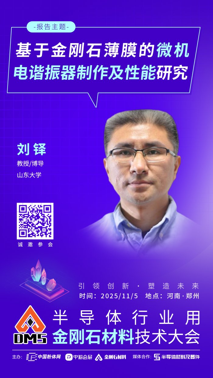 2025年11月5日,中國粉體網(wǎng)將在河南•鄭州舉辦“2025半導(dǎo)體行業(yè)用金剛石材料技術(shù)大會”。屆時,我們將邀請到山東大學(xué)劉鐸教授出席本次大會并作題為《基于金剛石薄膜的微機電諧振器制作及性能研究》的報告。