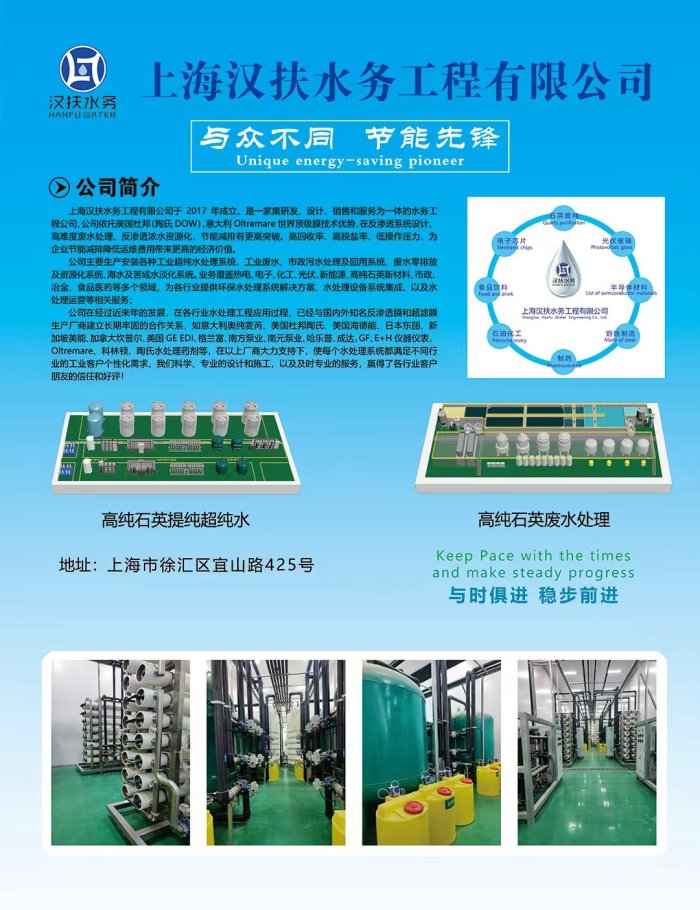 上海漢扶水務工程有限公司于 2017 年成立,是一家集研發、設計、銷售和服務為一體的水務工程公司,公司依托美國杜邦(陶氏 DOW),意大利 Oltremare 世界頂級膜技術優勢,在反滲透系統設計、高難度廢水處理、反滲透濃水資源化,節能減排有更高突破。高回收率、高脫鹽率、低操作壓力、為企業節能減排降低運維費用帶來更高的經濟價值。