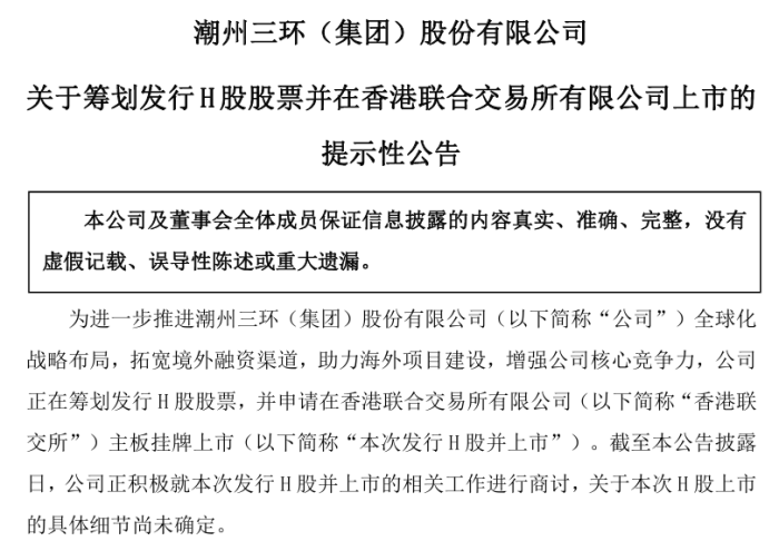 中國粉體網訊 10月30日,三環集團發布公告稱,為進一步推進公司全球化戰略布局,拓寬境外融資渠道,助力海外項目建設,增強公司核心競爭力,公司正在籌劃發行H股股票,并申請在香港聯交所主板掛牌上市。公司正積極就本次發行H股并上市的相關工作進行商討,關于本次H股上市的具體細節尚未確定。