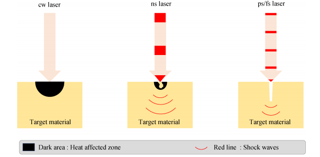 在微納加工過程中,通常選用脈沖寬度小于百皮秒量級的超快激光作為光源,如飛秒激光和皮秒激光,其具有以下優點: