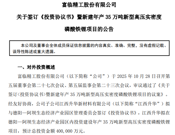 10月29日,富臨精工發布公告稱,子公司江西升華擬與德陽—阿壩生態經濟產業園區管理委員會簽訂《投資協議書》,江西升華擬在德陽—阿壩生態經濟產業園區內投資建設年產35萬噸新型高壓實密度磷酸鐵鋰項目,預計總投資金額40億元。