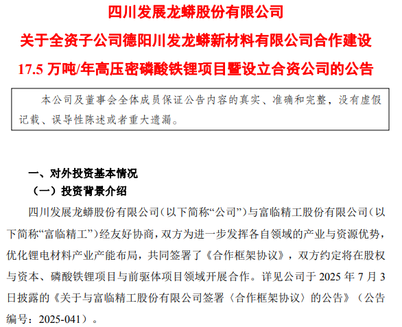 同日,川發龍蟒披露全資子公司德陽川發龍蟒新材料有限公司合作建設17.5萬噸/年高壓實磷酸鐵鋰項目暨設立合資公司的公告,四川發展龍蟒股份有限公司與富臨精工股份有限公司共同簽署了《合作框架協議》,雙方約定將在股權與資本、磷酸鐵鋰項目與前驅體項目領域開展合作。