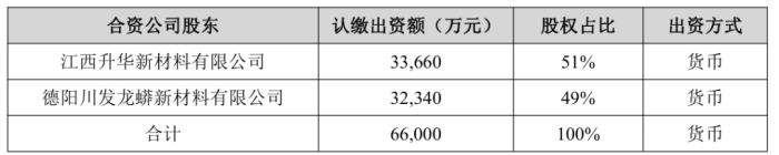 并且,川發龍蟒與富臨精工擬共同出資設立合資公司富臨龍蟒新材料有限公司,合資公司設立時的注冊資本金為人民幣66,000萬元,其中,江西升華出資33,660萬元,占合資公司注冊資本的51%,德陽川發龍蟒出資32,340萬元,占合資公司注冊資本的49%;并以合資公司為主體開展17.5萬噸/年高壓實磷酸鐵鋰項目的投資、建設和運營,本項目預計總投資金額19.61億元,資金來源為合資公司自有及自籌。