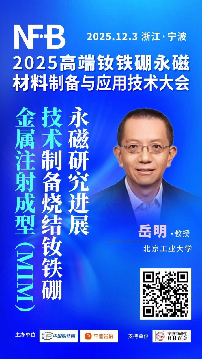 2025年12月3日,中國粉體網將在浙江·寧波舉辦“2025高端釹鐵硼永磁材料制備與應用技術大會”。屆時,我們邀請到北京工業大學岳明教授出席本次大會并作題為《金屬注射成型(MIM)技術制備燒結釹鐵硼永磁研究進展》的報告,岳明教授將為您介紹MIM技術的混煉、成形、脫脂和燒結等環節對燒結釹鐵硼的物相、組織和結構的影響并介紹國內外相關的研究進展。