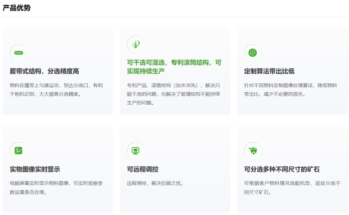 利用光學技術,實現對礦石中雜質的快速、識別與分離。適用于各類礦石的精選加工,提高礦石品質,降低生產成本。