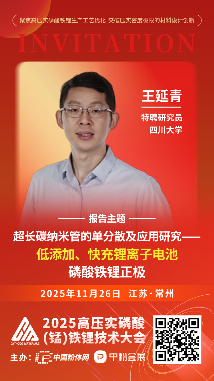 中國粉體網將于2025年11月26日在江蘇·常州舉辦“2025高壓實磷酸(錳)鐵鋰技術大會”。本屆大會將聚焦高壓實磷酸鐵鋰生產工藝優化、突破壓實密度極限的材料設計創新、錳溶出問題的終極解決方案,以及從實驗室到量產的全鏈條工藝優化等議題展開交流討論!屆時,來自四川大學的特聘研究員王延青將作題為《超長碳納米管的單分散及應用研究——低添加、快充鋰離子電池磷酸鐵鋰正極》的報告。