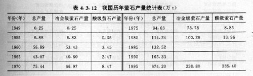 我國(guó)螢石資源豐富,生產(chǎn)礦山眾多,生產(chǎn)能力巨大。據(jù)統(tǒng)計(jì),至1995年,我國(guó)以礦石計(jì)算儲(chǔ)量的28處已利用礦區(qū)的規(guī)模為7.8萬(wàn)t/a,實(shí)際生產(chǎn)能力為 17.6萬(wàn)t/a,以礦物量計(jì)算儲(chǔ)量134處已利用礦區(qū)的規(guī)模為162萬(wàn)t/a,實(shí)際生產(chǎn)能力為112.2萬(wàn)t/a。我國(guó)螢石產(chǎn)量1949年僅為0.25 萬(wàn)t,隨著國(guó)民經(jīng)濟(jì)的發(fā)展而飛速增長(zhǎng),至1995年已達(dá)到674.2萬(wàn)t,躍居世界首位(表4.3.12)。