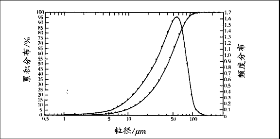 粒徑及粒徑分布的測定是激光粒度儀最普遍的用途。對粉末涂料,已發布的國際標準ISO8310—13CoatingPowders2Part13:ParticleSizeAnalysisbyLaserDiffraction規定了用激光衍射法直接測量粉末涂料等效球體粒徑分布的方法。實際上該測試方法也適用其他干粉狀試樣的粒度測試。依照此測試方法曾對粉末涂料、二氧化鈦、鐵紅、珠光顏料、磷酸鋅、硫酸鋇、鋅粉等多種粉狀試樣進行了粒度分布的測試。圖1為某種粉末涂料的粒度分布曲線(激光粒度儀還有以表格法、函數法表示的粒度分布以及其它一些粒徑參數值,在此從略)。