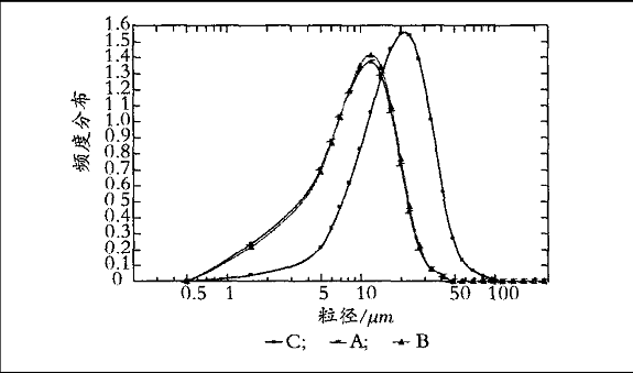 在涂料工業中常遇到同一配方在不同廠或同一廠不同批次的產品質量不同的情況,以及產品在貯存期間質量發生變化的問題。這些情況用傳統的質量控制方法往往不易察覺,而用激光粒度法有助于解決這類問題。圖3為同一廠家制造的三批組成及生產工藝相同的珠光顏料的粒徑分布圖,其中樣品A為參比樣。由圖3分布曲線可知,樣品B與樣品A的粒徑分布基本相同,而樣品C的粗粉含量較多。從廠家反饋的信息也證實,樣品B的使用效果滿足要求,而樣品C因含有較多的粗顆粒,使用效果不及樣品B。